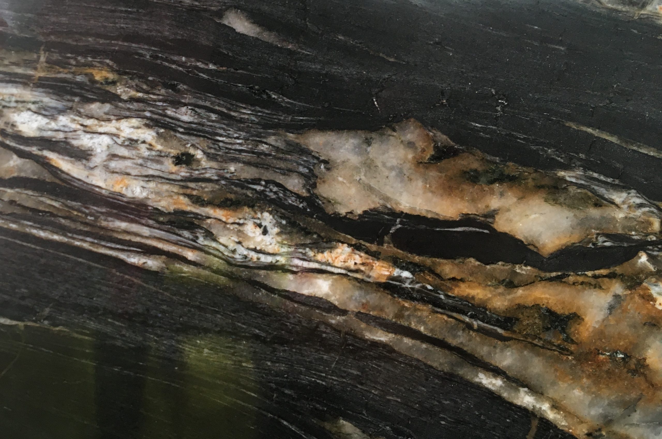 Kremeň z juhoafrickej Namíbie s pozoruhodným kontrastom prevažne čierneho základu a veľkými žilkami bielych a medených odtieňov.