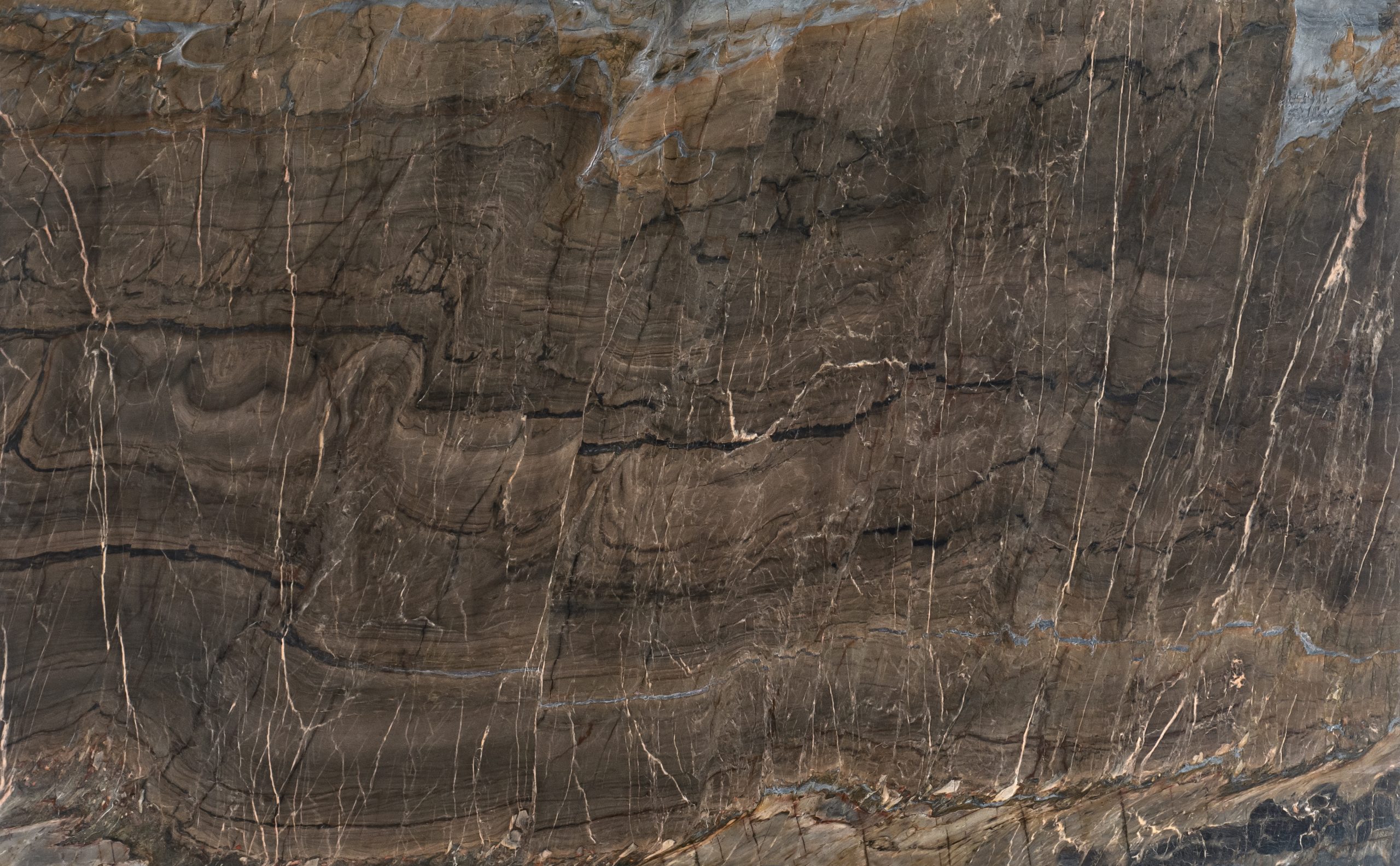 Jedinečný brazílsky kremeň s hnedým pozadím a čiernymi a béžovými žilkami.